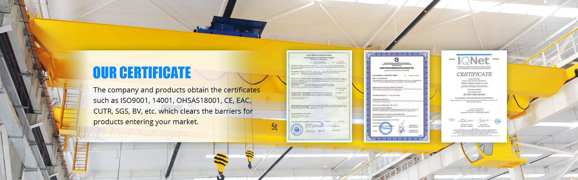 Wij kunnen u allerlei industriekranen leveren van 0.25tons tot 900tons, passen GB / T 19001-2000 idt ISO 9001: 2000, GB / T 24001-2004 idt ISO 14001: 2004, GB / T 28001-2001, OHSAS 18001: 1999, CE, GOST, SGS, TUV, BV enzovoort.